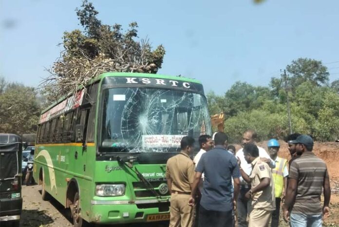 ರಸ್ತೆ ಅಗಲೀಕರಣ ಕಾಮಗಾರಿಗಾಗಿ ಮರ ತೆರವುಗೊಳಿಸುತ್ತಿದ್ದಾಗ ರಸ್ತೆಯಲ್ಲಿ ನಿಲ್ಲಿಸಿದ್ದ ಸರ್ಕಾರಿ ನರ್ಮ್ ಬಸ್ ಮೇಲೆ ಮರ ಬಿದ್ದು, ಮುಂಭಾಗದ ಗಾಜು ಪುಡಿಯಾಗಿ, ಪ್ರಯಾಣಿಕರು ಸಣ್ಣಪುಟ್ಟ ಗಾಯಗಳೊಂದಿಗೆ ಪಾರಾದ ಘಟನೆ ಉಡುಪಿ ಜಿಲ್ಲೆಯ ನೆಲ್ಲಿಕಾರು ಬಳಿ ಬುಧವಾರ ನಡೆದಿದೆ.