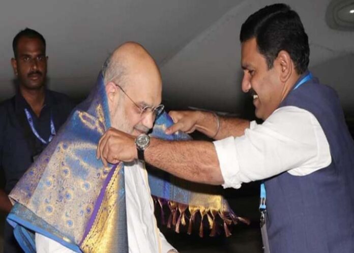 ವಿಶೇಷ ವಿಮಾನದ ಮೂಲಕ ಎಚ್ಎಎಲ್ ವಿಮಾನ ನಿಲ್ದಾಣಕ್ಕೆ ಅಮಿತ್ ಶಾ ಆಗಮಿಸಿದ್ದು, ಬಿಜೆಪಿ ರಾಜ್ಯಾಧ್ಯಕ್ಷ ಬಿ.ವೈ. ವಿಜಯೇಂದ್ರ ಅವರಿಗೆ ಶಾಲು ಹೊದಿಸಿ ಸ್ವಾಗತ ಕೋರಿದ್ದಾರೆ.