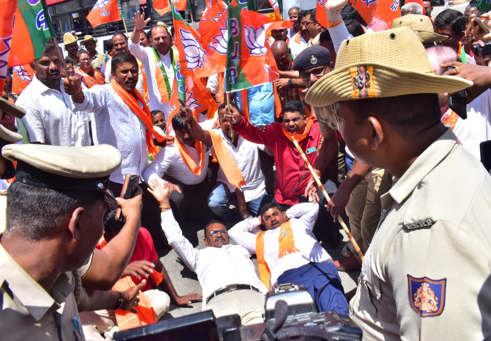 ಬಿಜೆಪಿ ಪಕ್ಷದ ಕಚೇರಿಯಿಂದ ಮೆರವಣಿಗೆ ಮೂಲಕ ಜಯಚಾಮರಾಜೇಂದ್ರ ಒಡೆಯರ್ ವೃತ್ತಕ್ಕೆ ಬಂದ ಪಕ್ಷದ ಮುಖಂಡರು, ಕಾರ್ಯಕರ್ತರನ್ನು ಪೊಲೀಸರು ವಶಕ್ಕೆ ಪಡೆದರು.