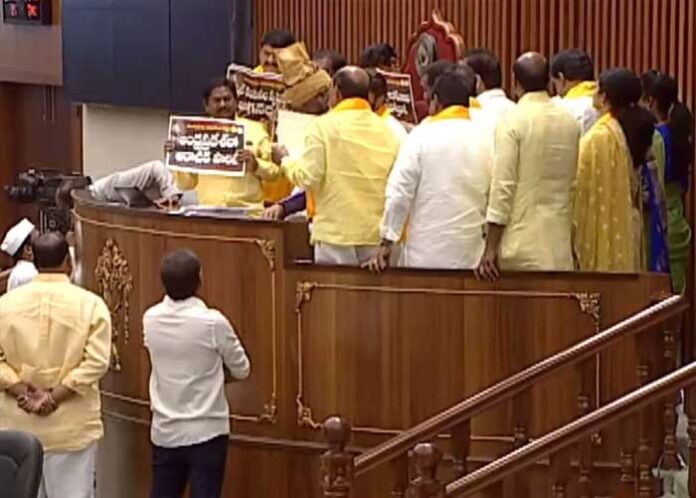 ಶಾಸಕ ಕೋಟಂರೆಡ್ಡಿ ,ಶ್ರೀಧರ್ ರೆಡ್ಡಿ ಸ್ಪೀಕರ್ ಮೈಕ್ ಧ್ವಂಸ ಮಾಡಲು ಯತ್ನಿಸಿದರು. ಟಿಡಿಪಿ, ವೈಸಿಪಿ ಶಾಸಕರ ನಡುವಿನ ಗಲಾಟೆ ಘರ್ಷಣೆ ಹಂತಕ್ಕೆ ತಲುಪಿದ್ದರಿಂದ ತಾಳ್ಮೆಯಿಂದ ವರ್ತಿಸುವಂತೆ ಸ್ಪೀಕರ್ ಸೂಚಿಸಿದರು. ವಾಗ್ವಾದದಿಂದ ಸದನದಲ್ಲಿ ಗೊಂದಲದ ವಾತಾವರಣ ಉಂಟಾಗಿತ್ತು.