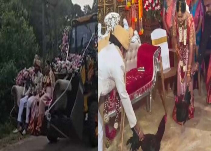 ಜೆಸಿಬಿಯಲ್ಲಿ ಬಂದ್ರು ಮದುಮಕ್ಕಳು, ಮದುವೆ ಮಂಟಪದಲ್ಲೇ ನಡೆಯಿತು‘ಕೋಳಿಕಟ್ಟ’!