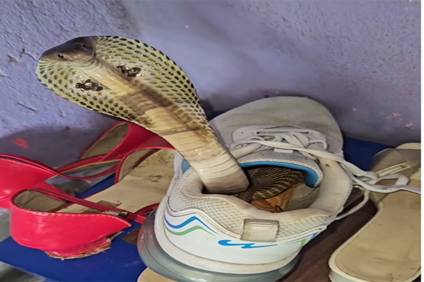 ವೈರಲ್ ಆಗಿರುವ ವಿಡಿಯೋದಲ್ಲಿ ಶೂ ಒಳಗೆ ನಾಗರ ಹಾವು ಬೆಚ್ಚಗೆ ಮಲಗಿರುವುದನ್ನು ಕಾಣಬಹುದು. ಶೂ ಒಳಗಿನಿಂದ ಹಾವು ಬುಸುಗುಟ್ಟುತ್ತಾ ಹೆಡೆ ಎತ್ತಿ ನಿಂತಿದೆ.