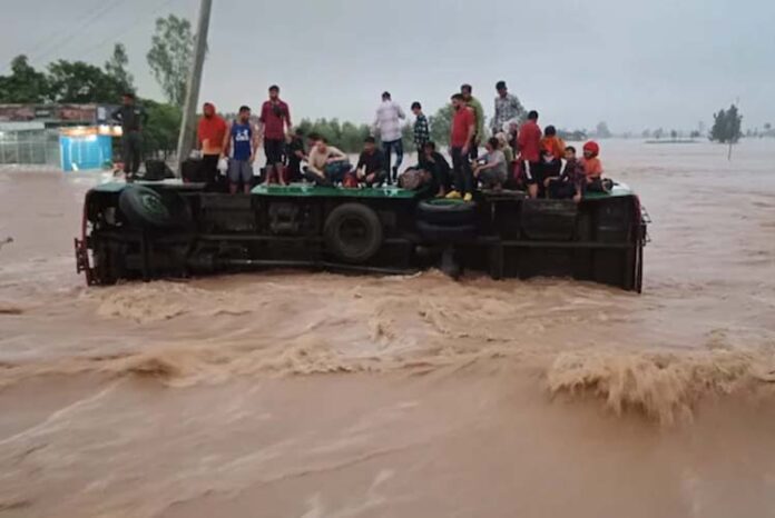 ಪಂಜಾಬ್ನ ಅಂಬಾಲಾ-ಯಮುನಾನಗರ ರಸ್ತೆಯಲ್ಲಿ ಪ್ರವಾಹಕ್ಕೆ ಸಿಲುಕಿ ಬಸ್ ಮಗುಚಿದೆ. ಬಸ್ ನಿಂದ ಪ್ರಯಾಣಿಕರನ್ನು ಕ್ರೇನ್ ಸಹಾಯದಿಂದ ರಕ್ಷಿಸಲಾಗಿದೆ.