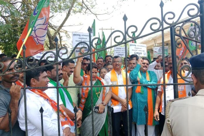 ಜಿಲ್ಲಾಧಿಕಾರಿಗಳ ಕಚೇರಿ ಎದುರು ಜಮಾಯಿಸಿದ ಬಿಜೆಪಿ ಕಾರ್ಯಕರ್ತರು ಕಾಂಗ್ರೆಸ್ ಸರ್ಕಾರದ ವಿರುದ್ಧ ಘೋಷಣೆಗಳನ್ನು ಕೂಗಿದರು.