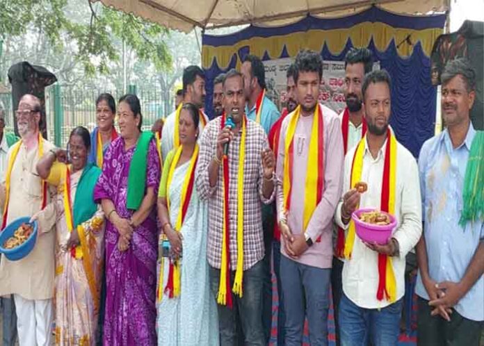 ನಗರದ ಸರ್ ಎಂ.ವಿ. ಪ್ರತಿಮೆ ಎದುರು ಜಿಲ್ಲಾ ರೈತ ಹಿತ ರಕ್ಷಣಾ ಸಮಿತಿ ಜೊತೆಗೂಡಿದ ಕನ್ನಡ ಸೇನೆ ಕಾರ್ಯಕರ್ತರು ಬೆಂಗಳೂರು ಮೈಸೂರು ಹೆದ್ದಾರಿಯಲ್ಲಿ ಹಬ್ಬದ ತಿಂಡಿ ತಿನಿಸುಗಳನ್ನು ಸೇವಿಸುವ ಮೂಲಕ ಹೋರಾಟ ಮುಂದುವರಿಸಿದರು.
