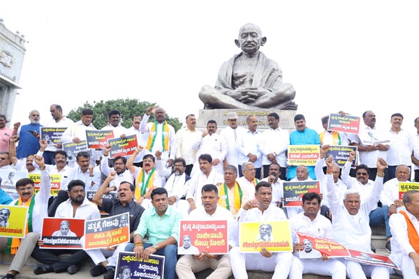 ವಿಧಾನಸೌಧದ ಗಾಂಧಿ ಪ್ರತಿಮೆ ಎದುರು ಬಿಜೆಪಿ ನಾಯಕರು ಪ್ರತಿಭಟನೆ ನಡೆಸಿದರು. ಪ್ಲೆಕಾರ್ಡ್ಗಳನ್ನು ಪ್ರದರ್ಶಿಸಿ ಕಾಂಗ್ರೆಸ್ ಸರ್ಕಾರ ಹಾಗೂ ಸಿಎಂ ಸಿದ್ದರಾಮಯ್ಯ ವಿರುದ್ಧ ಆಕ್ರೋಶ ಹೊರಹಾಕಿದರು.ಈ ವೇಳೆ ವಿಧಾನಸೌಧಕ್ಕೆ ಬೀಗ ಹಾಕಲು ಮುಂದಾದರು. ಆದರೆ ವಿಪಕ್ಷಗಳ ನಾಯಕರ ಯತ್ನವನ್ನು ಪೊಲೀಸರು ವಿಫಲಗೊಳಿಸಿದರು. ಈ ವೇಳೆ ಪ್ರತಿಭಟನಾ ಸ್ಥಳದಲ್ಲಿ ಹೈಡ್ರಾಮಾ ಸೃಷ್ಟಿಸಿದರು.