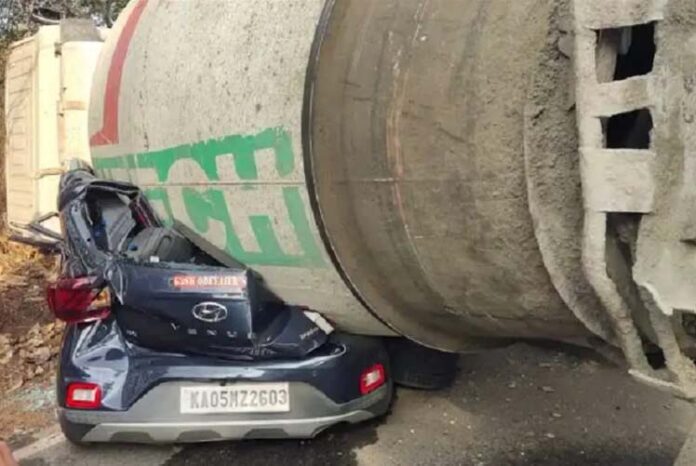 ಬೆಂಗಳೂರಿನ ಬನ್ನೇರುಘಟ್ಟ ಸಮೀಪದ ಬ್ಯಾಲಮರದ ದೊಡ್ಡಿ ಬಳಿ ಕಾಂಕ್ರಿಟ್ ಮಿಕ್ಸರ್ ಲಾರಿಯೊಂದು ನಿಯಂತ್ರಣ ತಪ್ಪಿ ಕಾರಿ ಮೇಲೆ ಉರುಳಿ ಬಿದ್ದ ಘಟನೆ ನಡೆದಿದೆ.