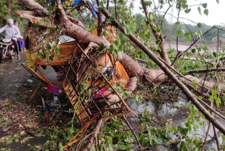 ಸಂಜೆ ಸುರಿದ ಭಾರಿ ಗಾಳಿ ಮಳೆಗೆ ರಾಜ್ಯ ಹೆದ್ದಾರಿ 137ರಲ್ಲಿ ಸಮೀಪದ ಹಾಡಲಗಿ ಗ್ರಾಮದ ಬಳಿ ಗೂಡ್ಸ್ ಆಟೋ ರಿಕ್ಷಾದ ಮೇಲೆ ಬೃಹತ್ ಗಾತ್ರದ ಮರ ಬಿದ್ದು ಆಟೋ ಸಂಪೂರ್ಣ ಜಖಂಗೊಂಡಿದೆ. ಅದೃಷ್ಟವಶಾತ್ ಆಟೋ ಚಾಲಕ ಪ್ರಾಣಾಪಾಯದಿಂದ ಪಾರಾಗಿದ್ದಾನೆ.