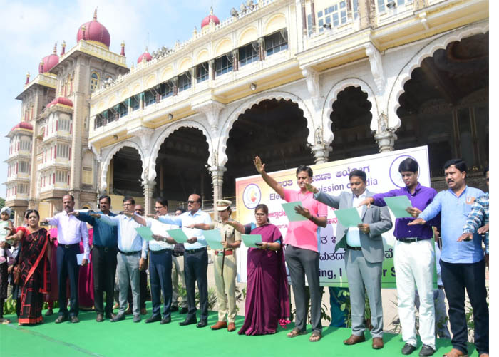 ಜಿಲ್ಲಾಡಳಿತ ಹಾಗೂ ಜಿಲ್ಲಾ ಸ್ವೀಪ್ ಸಮಿತಿಯ ವತಿಯಿಂದ ಅರಮನೆ ಮುಂಭಾದದಲ್ಲಿ ಅಯೋಜಿಸಿದ ಮತದಾನ ಜಾಗೃತಿ ಕಾರ್ಯಕ್ರಮವನ್ನು ಉದ್ಘಾಟಿಸಿ ಮಾತನಾಡಿದ ಅವರು, ಪ್ರತಿಯೊಬ್ಬರು ಚುನಾವಣೆಯಲ್ಲಿ ಪಾಲ್ಗೊಂಡು ಮತದಾನವನ್ನು ಮಾಡಿ ನಿಮ್ಮ ಅಕ್ಕಪಕ್ಕದಲ್ಲಿನ ಸಾರ್ವಜನಿಕರಲ್ಲಿಯೂ ಕೂಡ ಮತದಾನದ ಬಗ್ಗೆ ಅರಿವು ಮೂಡಿಸಿ ಎಂದರು.