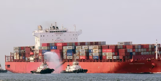ಸ್ಯಾನ್ ಫೆರ್ನಾಂಡೋ, 300 ಮೀಟರ್ ಉದ್ದದ ಸರಕು ಹಡಗು, ವಿಝಿಂಜಮ್ ಇಂಟರ್ನ್ಯಾಷನಲ್ ಸೀಪೋರ್ಟ್ ಲಿಮಿಟೆಡ್ (VISL) ನಲ್ಲಿ 1,900 ಕಂಟೇನರ್ಗಳನ್ನು ಆಫ್ಲೋಡ್ ಮಾಡುತ್ತದೆ.