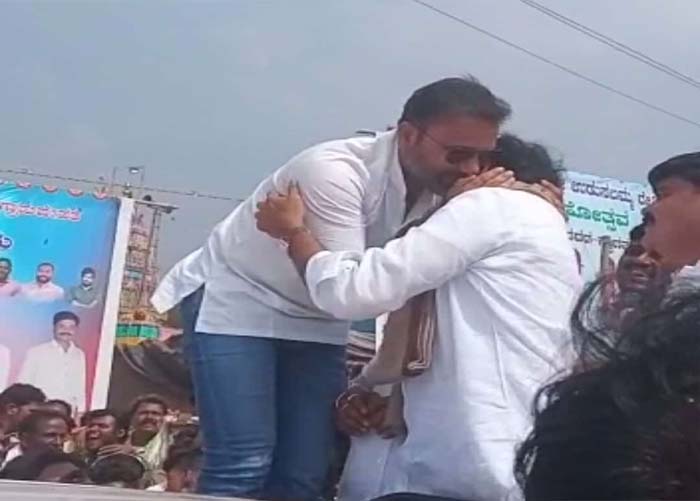 ಸಾರಿಗೆ ಸಚಿವ ಬಿ.ಶ್ರೀರಾಮುಲುಗೆ ಕಾಂಗ್ರೆಸ್ ನ ಮಾಜಿ ಸಚಿವ ಸಂತೋಷ್ ಲಾಡ್ ಅವರು ತೆರೆದ ವಾಹನದಲ್ಲೇ ಆಲಂಗಿಸಿ ಮುತ್ತಿಟ್ಟಿದ್ದು,