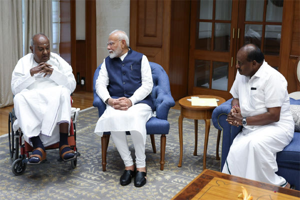 ರಾಜ್ಯಸಭಾ ಸದಸ್ಯ ಹಾಗೂ ಮಾಜಿ ಪ್ರಧಾನಿ ಹೆಚ್.ಡಿ.ದೇವೇಗೌಡರು ಹಾಗೂ ಕೇಂದ್ರ ಸಚಿವ ಹೆಚ್.ಡಿ.ಕುಮಾರಸ್ವಾಮಿ ಅವರು ಪ್ರಧಾನಿ ನರೇಂದ್ರ ಮೋದಿ ಅವರನ್ನು ಭೇಟಿಯಾಗಿದ್ದಾರೆ.