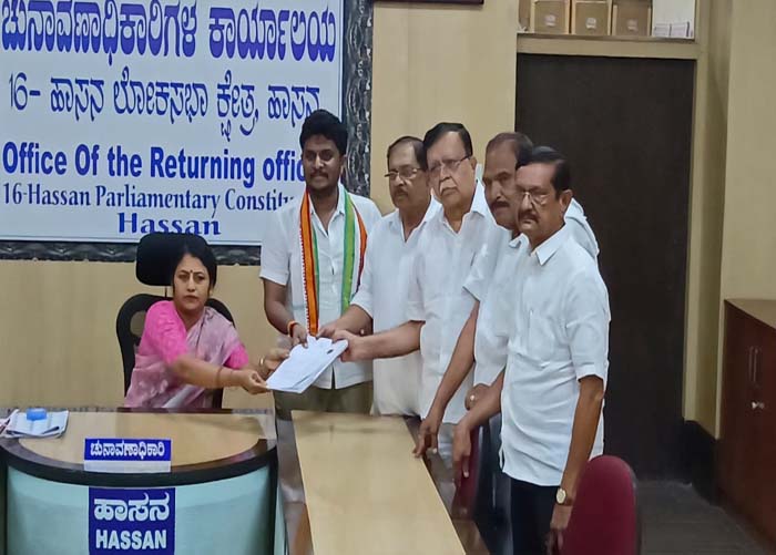 ಹಾಸನ ಲೋಕಸಭಾ ಚುನಾವಣೆ ಕಾಂಗ್ರೆಸ್ ಅಭ್ಯರ್ಥಿ ಶ್ರೇಯಸ್‌ಪಟೇಲ್ ಗೃಹಸಚಿವ ಜಿ.ಪರಮೇಶ್ವರ್, ಸಹಕಾರ ಸಚಿವ ಕೆ.ಎನ್.ರಾಜಣ್ಣ, ಗೃಹಮಂಡಳಿ ಅಧ್ಯಕ್ಷ ಕೆ.ಎಂ.ಶಿವಲಿಂಗೇಗೌಡ ಉಪಸ್ಥಿತಿಯಲ್ಲಿ ನಾಮಪತ್ರ ಸಲ್ಲಿಸಿದರು.