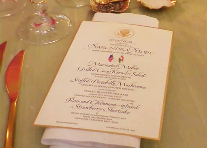 ಈ ಔತಣಕೂಟದ ಮೆನುವಿನಲ್ಲಿ ವಿಶೇಷವಾಗಿ ಸಿರಿಧಾನ್ಯ, ಕಾರ್ನ್ ಕರ್ನಲ್ ಸಲಾಡ್ ಮತ್ತು ಸ್ಟಫ್ಡ್ ಮಶ್ರೂಮ್ಗಳು ಪ್ರಮುಖ ಸ್ಥಾನದಲ್ಲಿವೆ. ಪ್ರಧಾನಿಯವರು ಸಸ್ಯಹಾರಿಯಾಗಿದ್ದು, ಅದನ್ನು ಗಮನದಲ್ಲಿಟ್ಟುಕೊಂಡಿರುವ ಅಮೆರಿಕದ ಪ್ರಥಮ ಮಹಿಳೆ ಜಿಲ್ ಬೈಡನ್, ಸಸ್ಯಾಹಾರಿ ಪಾಕಪದ್ಧತಿಯಲ್ಲಿ ಪರಿಣತಿ ಹೊಂದಿರುವ ಬಾಣಸಿಗ ನೀನಾ ಕರ್ಟಿಸ್ ಅವರನ್ನು ಶ್ವೇತಭವನದ ಸಿಬ್ಬಂದಿಯೊಂದಿಗೆ ಕೆಲಸ ಮಾಡಲು ಮತ್ತು ಅದ್ಭುತವಾದ ಸಸ್ಯಾಹಾರಿ ಮೆನುವನ್ನು ತಯಾರಿಸುವ ಜವಾಬ್ದಾರಿ ವಹಿಸಿದ್ದಾರೆ.