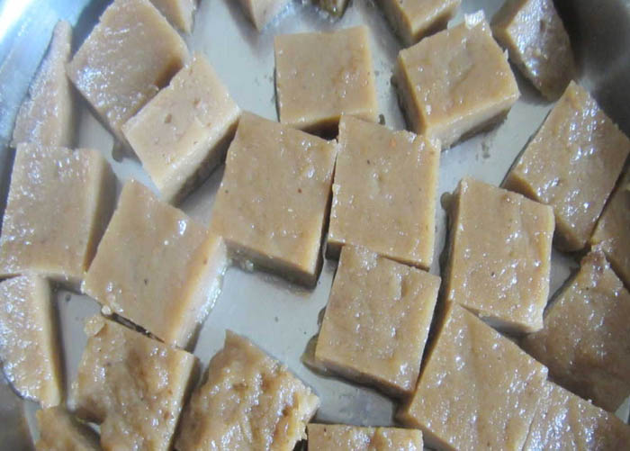 ತುಪ್ಪ ಅಂಟಿಸಿದ ತಟ್ಟೆಗೆ ಈ ಮಿಶ್ರಣ ಹಾಕಿ ತಣ್ಣಗಾಗಲು ಬಿಡಿ