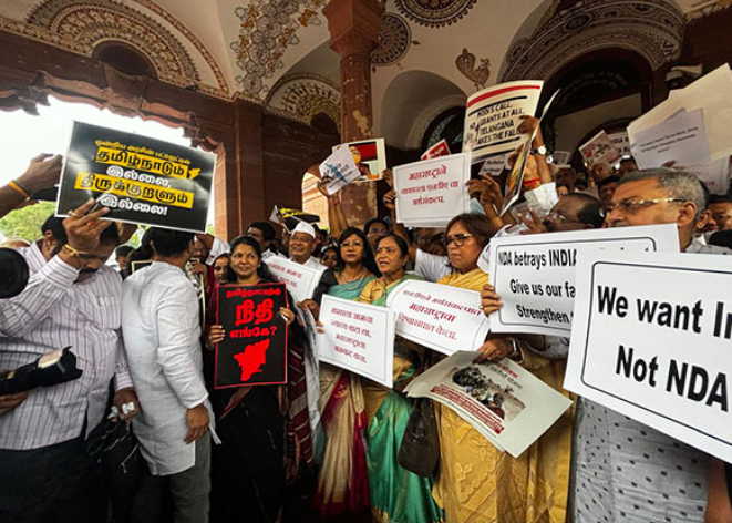 ಕೇಂದ್ರ ಬಜೆಟ್‌ನ ತಾರತಮ್ಯದ ವಿರುದ್ಧ ಸಂಸತ್ತಿನಲ್ಲಿ I.N.D.I.A ಬಣ ಪ್ರತಿಭಟನೆ