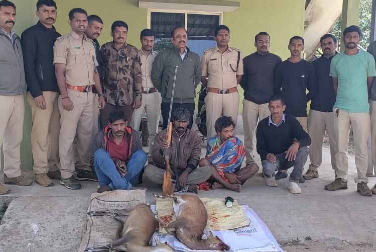 ದೇವರ ಕಾಡಿಗೆ ಅಕ್ರಮ ಪ್ರವೇಶ ಮಾಡಿ ಎರಡಿ ಹೆಣ್ಣು ಕಾಡು ಕುರಿಗಳನ್ನು ಗುಂಡಿಕ್ಕಿ ಹತ್ಯೆ ಮಾಡಿರುವ ಪ್ರಕರಣ ಮೂರ್ನಾಡು ಸಮೀಪದ ಮುತ್ತಾರ್‍ಮುಡಿ ಗ್ರಾಮದಲ್ಲಿ ನಡೆದಿದ್ದು, ಈ ಸಂಬಂಧ 4 ಮಂದಿ ಆರೋಪಿಗಳನ್ನು ಮಡಿಕೇರಿ ವಲಯ ಅರಣ್ಯ ಇಲಾಖೆ ಅಧಿಕಾರಿಗಳು ಬಂಧಿಸಿದ್ದಾರೆ.