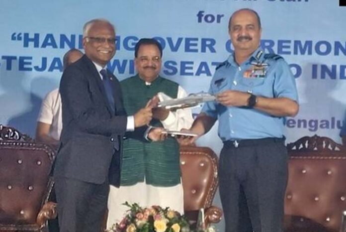 ಬೆಂಗಳೂರಿನಲ್ಲಿ ಇಂದು ನಡೆದ ಕಾರ್ಯಕ್ರಮದಲ್ಲಿ ಭಾರತೀಯ ವಾಯುಪಡೆಯ ಮುಖ್ಯಸ್ಥ ಏರ್ ಚೀಫ್ ಮಾರ್ಷಲ್ ವಿಆರ್ ಚೌಧರಿ ಅವರಿಗೆ ಎಚ್ಎಎಲ್ನ ಮುಖ್ಯ ವ್ಯವಸ್ಥಾಪಕ ನಿರ್ದೇಶಕ ಸಿ.ಬಿ. ಅನಂತಕೃಷ್ಣನ್ ಅವರು ನೆಲ ಮತ್ತು ಜಲದ ಮೇಲೆ ಸುಲಭವಾಗಿ ಹಾರಾಡಬಲ್ಲ ತೇಜಸ್ ಸರಣಿಯ ಲಘು ಯುದ್ಧ ವಿಮಾನವನ್ನು ನೀಡಿದರು.