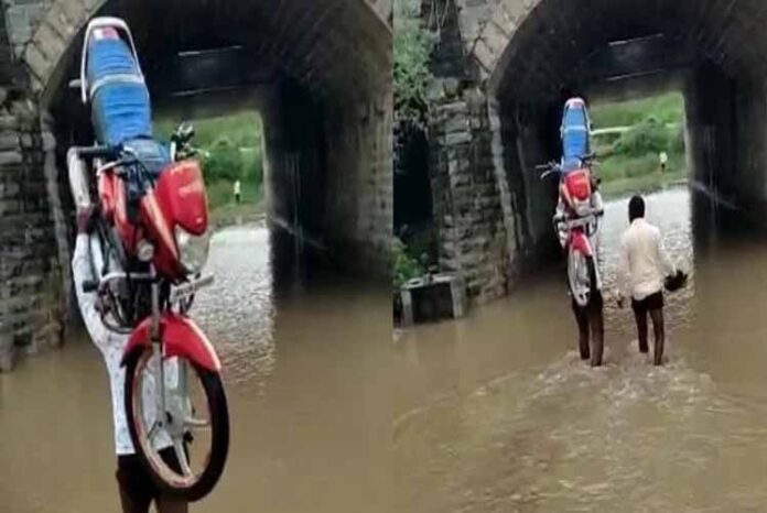 ನಿಂತ ನೀರಲ್ಲಿ ಬೈಕ್ ಸಾಗದ ಹಿನ್ನೆಲೆ ಸವಾರನೊಬ್ಬ ಹೆಗಲ ಮೇಲೆ ಎಚ್‌ಎಫ್‌ ಡಿಲಕ್ಸ್‌ ಬೈಕ್‌ಅನ್ನೇ ಹೊತ್ತು ಅಂಡರ್‌ಪಾಸ್‌ ದಾಟ್ಟಿದ್ದಾರೆ. ಬೈಕ್ ಹೊತ್ತು ಸಾಗುವ ವಿಡಿಯೊವನ್ನು ಸ್ಥಳೀಯರು ತಮ್ಮ ಮೊಬೈಲ್‌ನಲ್ಲಿ ಸೆರೆ ಹಿಡಿದಿದ್ದಾರೆ. ಸೋಶಿಯಲ್‌ ಮೀಡಿಯಾದಲ್ಲಿ ಇದು ವೈರಲ್‌ ಆಗುತ್ತಿದ್ದು, ಯಾರಪ್ಪ ಇದು ಆಧುನಿಕ ಬಾಹುಬಲಿ ಎಂದು ನೆಟ್ಟಿಗರು ಕಾಮೆಂಟ್‌ ಮಾಡಿದ್ದಾರೆ.