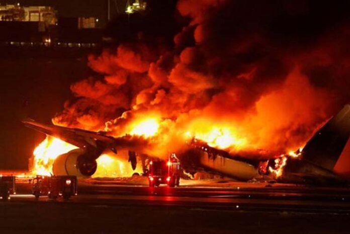 ಮಂಗಳವಾರ ಜಪಾನ್ ಏರ್‌ಲೈನ್ಸ್ ಜೆಟ್ ಕೋಸ್ಟ್ ಗಾರ್ಡ್ (Coast Guard aircraft) ವಿಮಾನಕ್ಕೆ ಪ್ರಯಾಣಿಕರ ವಿಮಾನ ಡಿಕ್ಕಿ ಹೊಡೆದ ಪರಿಣಾಮ ಬೆಂಕಿ ಹೊತ್ತಿಕೊಂಡಿದೆ . ಪ್ರಯಾಣಿಕ ವಿಮಾನದಲ್ಲಿದ್ದ ಎಲ್ಲಾ 367 ಪ್ರಯಾಣಿಕರು ಮತ್ತು 12 ಸಿಬ್ಬಂದಿಯನ್ನು ಸುರಕ್ಷಿತವಾಗಿ ಸ್ಥಳಾಂತರಿಸಲಾಗಿದೆ. ಆದರೆ ಕೋಸ್ಟ್ ಗಾರ್ಡ್ ವಿಮಾನದಲ್ಲಿದ್ದ ಆರು ಸಿಬ್ಬಂದಿಯಲ್ಲಿ ಐವರು ಮೃತಪಟ್ಟಿದ್ದಾರೆ ಎಂದು ವರದಿಯಾಗಿದೆ.