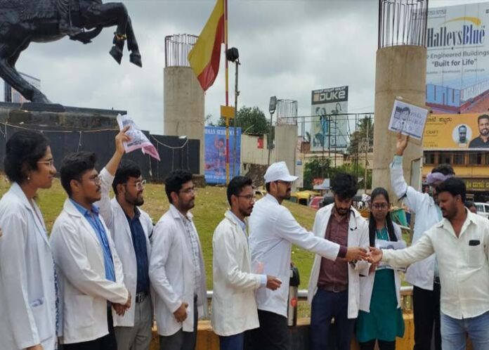 ಶನಿವಾರ ನಗರದ ಚನ್ನಮ್ಮ ವೃತ್ತ ಹಾಗೂ ಕೆಎಂಸಿ ಆಸ್ಪತ್ರೆಯ ಎದುರು ಸಮಾವೇಶಗೊಂಡ ವಿದ್ಯಾರ್ಥಿಗಳು ಚಹಾ ಮಾರುವ ಮೂಲಕ ಪ್ರತಿಭಟನೆ ನಡೆಸಿದರು. ವೈದ್ಯ ವೃತ್ತಿ ಮಾಡುವುದಕ್ಕಿಂತ ಚಹಾ ಮಾರುವುದು ಸುರಕ್ಷಿತ ಹಾಗೂ ಲಾಭದಾಯ ಎಂಬ ಉದ್ದೇಶದ ಮೂಲಕ ವಿಭಿನ್ನವಾಗಿ ಪ್ರತಿಭಟಿಸಿ ಆಕ್ರೋಶ ವ್ಯಕ್ತಪಡಿಸಿದರು.