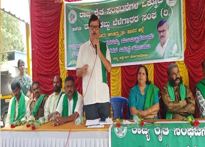 ಒಕ್ಕೂಟದ ತಾ. ಅಧ್ಯಕ್ಷ ಎಚ್. ಬಿ. ಧರ್ಮರಾಜ್ ಮಾತನಾಡಿ, ರಾಜ್ಯ ಸರ್ಕಾರ ಬರಗಾಲವೆಂಬ ಕಾರಣ ವಿದ್ಯುತ್ ಉತ್ಪಾದನೆ ಕುಂಠಿತ ಎಂದು ರೈತರಿಗೆ ಹೇಳಿ ಕೇವಲ ೫ಗಂಟೆ ವಿದ್ಯುತ್ ಕೊಡುತ್ತದೆ. ಪ್ರಜಾಪ್ರಭುತ್ವ ರೌಡಿಗಳ ರಾಜ್ಯವಾಗಿದೆ. ಜನರು ಎಚ್ಚೆತ್ತು ಸಂಘಟಿತ ಹೋರಾಟ ಮಾಡಬೇಕು. ಜಿಲ್ಲೆಯ ಆಲೂರು, ಸಕಲೇಶಪುರ, ಬೇಲೂರು ತಾಲ್ಲೂಕಿನಲ್ಲಿ ಕಾಡಾನೆ ಹಾವಳಿಯಿಂದ ರೈತ ತತ್ತರಿಸಿದ್ದಾನೆ. ಮಳೆ ಇಲ್ಲದೆ ಬಿತ್ತಿದ ಬೆಳೆ ನಾಶವಾಗಿದೆ. ಕೃಷಿಗಾಗಿ ಬ್ಯಾಂಕಿನಲ್ಲಿ ಸಾಲ ಮಾಡಿ ವಾಪಾಸು ಕಟ್ಟಲು ಹಣವಿಲ್ಲದೆ ಆತ್ಮಹತ್ಯೆ ದಾರಿ ಹಿಡಿಯುತ್ತಿದ್ದಾನೆ. ಅಲ್ಪಸ್ವಲ್ಪ ಇದ್ದ ಬೆಳೆಗೆ ನೀರು ಹಾಯಿಸಲು ಸೂಕ್ತ ಸಮಯದಲ್ಲಿ ಸಾಕಷ್ಟು ವಿದ್ಯುತ್ ಕೊಡುತ್ತಿಲ್ಲ. ರೈತರ ಉಳಿವಿಗಾಗಿ ಒಕ್ಕೂಟ ಸರ್ಕಾರದ ಅನೀತಿಗಳ ವಿರುದ್ಧ ಹೋರಾಡುತ್ತದೆ ಎಂದರು.