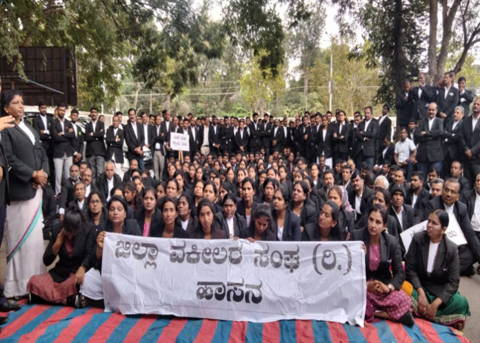 ಹೆಲ್ಮೆಟ್ ಹಾಕಿಲ್ಲ ಎಂದು ಚಿಕ್ಕಮಗಳೂರು ನಗರ ಪೊಲೀಸರು ವಕೀಲರ ಮೇಲೆ ಮನಸ್ಸೋ ಇಚ್ಛೆ ಹಲ್ಲೆ ನಡೆಸಿರುವುದನ್ನು ವಿರೋಧಿಸಿ ಹಾಸನ ಜಿಲ್ಲಾ ವಕೀಲರ ಸಂಘವು ಪೊಲೀಸ್ ಇಲಾಖೆ ವಿರುದ್ಧ ಜಿಲ್ಲಾಧಿಕಾರಿ ಕಚೇರಿ ಎದುರು ಬೃಹತ್ ಪ್ರತಿಭಟನೆ ನಡೆಸಿದರು.