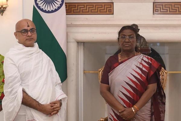 ಬೆಂಗಳೂರು: ಶ್ರೀಮನ್ ಮಧ್ವಾಚಾರ್ಯ ಮೂಲ ಮಹಾಸಂಸ್ಥಾನ ಉತ್ತರಾದಿ ಮಠದ ಮುಂಬೈ ಮಹಾನಗರ ಶ್ರೀಸತ್ಯಧ್ಯಾನ ವಿದ್ಯಾಪೀಠದ ಕುಲಪತಿಗಳು, ಕರ್ನಾಟಕದ ಪ್ರತಿಷ್ಠಿತ ರಾಜೋತ್ಸವ ಪ್ರಶಸ್ತಿ ಪುರಸ್ಕೃತರು, ಹಿರಿಯ ಪಂಡಿತ ಮಾಹುಲಿ ವಿದ್ಯಾಸಿಂಹಾಚಾರ್ಯ ಅವರು ರಾಷ್ಟ್ರಪತಿ ದ್ರೌಪದಿ ಮುರ್ಮು ಅವರನ್ನು ಮಂಗಳವಾರ ಮಧ್ಯಾಹ್ನ ಭೇಟಿ ಮಾಡಿದರು.