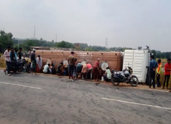 ಬೆಂಗಳೂರಿಗೆ ಚಲಿಸುತ್ತಿದ್ದ ಅಡುಗೆ ಎಣ್ಣೆ ತುಂಬಿದ್ದ ಲಾರಿ ಚಾಲಕನ ನಿಯಂತ್ರಣ ತಪ್ಪಿ ರಸ್ತೆ ಪಕ್ಕಕ್ಕೆ ಪಲ್ಟಿಯಾಗಿ ಬಿದ್ದಿದೆ. ಅದೃಷ್ಟವಶಾತ್ ಲಾರಿ ಚಾಲಕ, ಕ್ಲೀನರ್ ಅಪಾಯದಿಂದ ಪಾರಾಗಿದ್ದಾರೆ. ಆದರೆ ಲಾರಿಯಲ್ಲಿದ್ದ ಅಡುಗೆ ಎಣ್ಣೆ ಮಾತ್ರ ರಸ್ತೆಗೆ ಹರಿದು ಹೋಗಿದೆ. ಇದನ್ನು ಗಮನಿಸಿದ ಜನ ಎಣ್ಣೆ ತುಂಬಿಕೊಳ್ಳಲು ಮುಗಿಬಿದ್ದಿದ್ದಾರೆ.