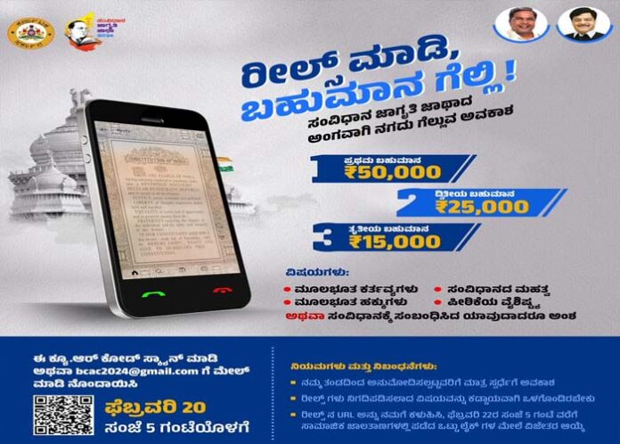 ಸಂವಿಧಾನ ಜಾಗೃತಿ ಜಾಥಾದ ಅಂಗವಾಗಿ ರೀಲ್ಸ್ ಮಾಡಿ ನಗದು ಗೆಲ್ಲುವ ಅವಕಾಶವನ್ನು ಸರ್ಕಾರ ನೀಡಿದ್ದು, ಪ್ರಥಮ ಬಹುಮಾನವಾಗಿ 50 ಸಾವಿರ ರೂಪಾಯಿ, ದ್ವಿತೀಯ ಬಹುಮಾನವಾಗಿ 25 ಸಾವಿರ ಹಾಗೂ ತೃತೀಯ ಬಹುಮಾನವಾಗಿ 15 ಸಾವಿರ ರೂಪಾಯಿ ಗೆಲ್ಲುವ ಅವಕಾಶ ನೀಡಿದೆ.