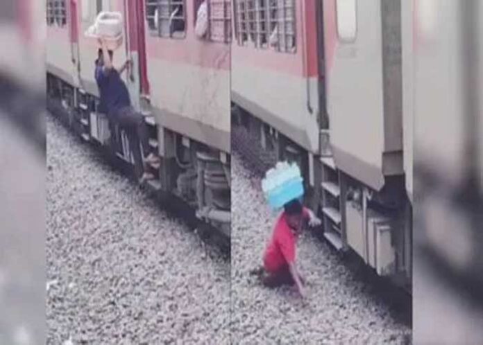 ರೈಲ್ವೆ ನಿಲ್ದಾಣದಲ್ಲಿ ನೀರಿನ ಬಾಟೆಲ್, ಆಹಾರ, ತಿನಿಸು ಮಾರುವವರನ್ನು ಕಂಡಿರುತ್ತೇವೆ. ಕೆಲವೊಮ್ಮೆ ರೈಲು ಚಲಿಸುತ್ತಿದ್ದರೂ ಹೊಟ್ಟೆ ಪಾಡಿಗಾಗಿ ಸಾಹಸ ದೃಶ್ಯಗಳೂ ಕಣ್ಣಿಗೆ ಬೀಳುತ್ತವೆ. ಅಂತೆಯೇ ಇಲ್ಲಿಯೂ ಒಬ್ಬ ವ್ಯಕ್ತಿ ನೀರಿನ ಬಾಟೆಲ್ಗಳನ್ನಿಡಿದು ಚಲಿಸುವ ರೈಲನ್ನು ಹತ್ತಲು ಪ್ರಯತ್ನಿಸುತ್ತಾನೆ. ಆದರೆ ಆಯತಪ್ಪಿ, ಕೆಳಗೆ ಬೀಳುವ ದೃಶ್ಯ ಭಯಾನಕವಾಗಿದೆ. ಅದೃಷ್ಟವಶಾತ್ ಅವರ ದೇಹವು ರೈಲಿನ ಚಕ್ರಗಳ ಅಡಿಯಲ್ಲಿ ಬೀಳಲಿಲ್ಲ.