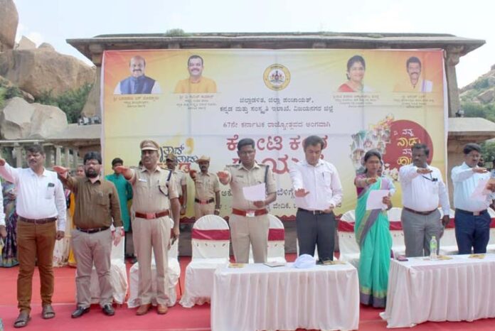 ವಿಶ್ವಪಾರಂಪರಿಕ ತಾಣ ಹಂಪಿಯ ಎದುರು ಬಸವಣ್ಣ ಮಂಟಪದ ಎದುರು ಶುಕ್ರವಾರ ನಡೆದ ಕೋಟಿ ಕಂಠ ಗಾಯನವು ಐತಿಹಾಸಿಕ ಕ್ಷಣಕ್ಕೆ ಸಾಕ್ಷಿಯಾಯಿತು.ವಿಜಯನಗರ ಜಿಲ್ಲಾಡಳಿತ, ಜಿಲ್ಲಾಪಂಚಾಯತ್ ಹಾಗೂ ಕನ್ನಡ ಮತ್ತು ಸಂಸ್ಕøತಿ ಇಲಾಖೆಯ ಸಂಯುಕ್ತಾಶ್ರಯದಲ್ಲಿ 67ನೇ ಕನ್ನಡರಾಜ್ಯೋತ್ಸವ ನಿಮಿತ್ತ ಕೋಟಿ ಕಂಠ ಗಾಯನ ಕಾರ್ಯಕ್ರಮ ಹಮ್ಮಿಕೊಳ್ಳಲಾಯಿತು. ಕೋಟಿ ಕಂಠ ಗಾಯನ ಕಾರ್ಯಕ್ರಮದಲ್ಲಿ ಕಲಾವಿದರಿಂದ ಮತ್ತು ಶಾಲಾ ಮಕ್ಕಳಿಂದ ರಾಷ್ಟ್ರಕವಿ ಕುವೆಂಪು ಅವರ ನಾಡಗೀತೆ “ಜಯ ಭಾರತ ಜನನಿಯ ತನುಜಾತೆ”, ಹುಯಿಲಗೋಳ ನಾರಾಯಣ್ರಾವ್ ಅವರ “ಉದಯವಾಗಲಿ ನಮ್ಮ ಚೆಲುವ ಕನ್ನಡನಾಡು”, ಚೆನ್ನವೀರಕಣವಿ ಅವರ “ವಿಶ್ವ ವಿನೂತನ ವಿದ್ಯಾಚೇತನ ಸರ್ವ ಹೃದಯ ಸಂಸ್ಕಾರಿ”, ಕುವೆಂಪು ಅವರ “ಬಾರಿಸು ಕನ್ನಡ ಡಿಂಡಿಮವ”, ಡಾ.ಡಿ ಎಸ್ ಕರ್ಕಿ ಅವರ “ಹಚ್ಚೇವು ಕನ್ನಡ ದೀಪ” ಹಾಗೂ ಹಂಸಲೇಖ ಅವರ “ಹುಟ್ಟಿದರೆ ಕನ್ನಡ ನಾಡಲ್ಲಿ ಹುಟ್ಟಬೇಕು” ಎಂಬ ಆರು ಗೀತೆಗಳನ್ನು ಹಾಡಲಾಯಿತು.