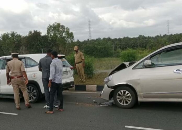 ಆಹಾರ ಮತ್ತು ನಾಗರೀಕ ಸರಬರಾಜು ಸಚಿವ ಕೆ.ಹೆಚ್. ಮುನಿಯಪ್ಪ ಅವರು ಪ್ರಯಾಣಿಸುತ್ತಿದ್ದ ಕಾರು ಅಪಘಾತಕ್ಕೀಡಾಗಿದೆ. ಶಾಂತಿಗ್ರಾಮ ರಸ್ತೆಯ ಮೂಲಕ ಹಾಸನಕ್ಕೆ ಆಗಮಿಸುತ್ತಿದ್ದ ವೇಳೆ ಶುಲ್ಕ ವಸೂಲಿ ಕೇಂದ್ರದ ಹತ್ತಿರ ಹಿಂಬದಿಯಿಂದ ಬಂದ ಕಾರು ಡಿಕ್ಕಿಯಾಗಿದೆ.