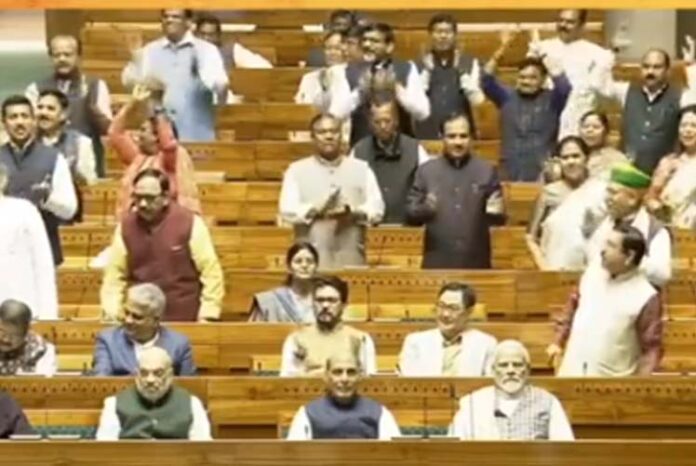 ಮೂರು ರಾಜ್ಯಗಳಲ್ಲಿ ನಡೆದ ವಿಧಾನಸಭಾ ಚುನಾವಣೆಯಲ್ಲಿ ಬಿಜೆಪಿ ಜಯಭೇರಿ ಬಾರಿಸಿದ ಒಂದು ದಿನದ ನಂತರ ಲೋಕಸಭೆಯಲ್ಲಿ ಸಂಸದರು ಘೋಷಣೆಗಳನ್ನು ಕೂಗಿದ್ದಾರೆ.