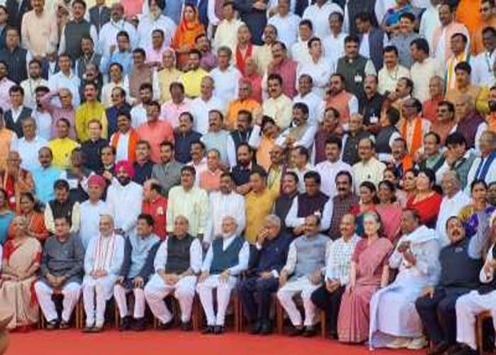 ಪ್ರಧಾನಿ ನರೇಂದ್ರ ಮೋದಿ, ಉಪರಾಷ್ಟ್ರಪತಿ ಮತ್ತು ರಾಜ್ಯಸಭಾ ಅಧ್ಯಕ್ಷ ಜಗದೀಪ್ ಧನಖರ್, ಲೋಕಸಭೆಯ ಅಧ್ಯಕ್ಷ ಓಂ ಬಿರ್ಲಾ ಮತ್ತು ಇತರ ಸಂಸದರು ಜಂಟಿ ಫೋಟೋ ಸೆಷನ್ನಲ್ಲಿ ಉಪಸ್ಥಿತರಿದ್ದರು.