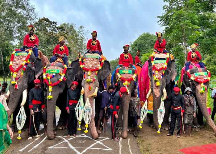 ವಿಶ್ವ ವಿಖ್ಯಾತ ನಾಡ ಹಬ್ಬ ಮೈಸೂರು ದಸರಾಗೆ ನಾಂದಿಯಾಡುವ ಗಜಪಯಣಕ್ಕೆ ಜಿಲ್ಲೆಯ ಹುಣಸೂರು ತಾಲೂಕಿನ ನಾಗರಹೊಳೆ ಉದ್ಯಾನದ ಹೆಬ್ಬಾಗಿಲು ವೀರನಹೊಸಹಳ್ಳಿ ಬಳಿ ಇಂದು ಅಲಂಕೃತ ಗಜಗಳಿಗೆ ಪುಷ್ಪರ್ಚನೆ ಮಾಡುವ ಮೂಲಕ ಮೈಸೂರು ಜಿಲ್ಲಾ ಉಸ್ತುವಾರಿ ಸಚಿವ ಹೆಚ್.ಸಿ.ಮಹದೇವಪ್ಪ ಚಾಲನೆ ನೀಡಿದರು.