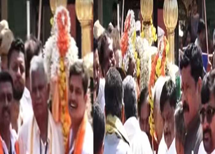 ಜಂಬೂಸವಾರಿ ಮೆರವಣಿಗೆಗೂ ಮುನ್ನ ಅರಮನೆಯ ಬಲರಾಮ ಗೇಟ್ ಮುಂಭಾಗನಾಡದೊರೆ ಸಿದ್ದರಾಮಯ್ಯ ನಂದಿಧ್ವಜಕ್ಕೆ ಪೂಜೆ ಸಲ್ಲಿಸಿದರು. ಮಧ್ಯಾಹ್ನ 1.40ಕ್ಕೆ ಸರಿಯಾಗಿ ಪೂಜೆ ನೆರವೇರಿಸಿದ ಸಿದ್ದರಾಮಯ್ಯ, ಬಳಿಕ ತೆರೆದ ವಾಹನದಲ್ಲಿ ಅರಮನೆಯತ್ತ ಮೆರವಣಿಗೆ ಮೂಲಕ ಬಂದರು. ಈ ಸಂದರ್ಭದಲ್ಲಿ ಉಪಮುಖ್ಯಮಂತ್ರಿ ಡಿ.ಕೆ.ಶಿವಕುಮಾರ್ ಸಾಥ್ ನೀಡಿದರು.