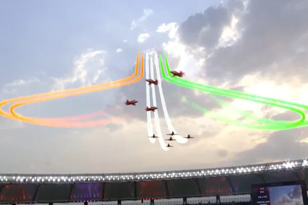 ಇದೇ ವೇಳೆ ವಾಯುಪಡೆಯಿಂದ ಏರ್ ಶೋ ಕೂಡ ನಡೆಯಿತು. ದೇಶದ ಅತಿದೊಡ್ಡ ಕ್ರೀಡಾಂಗಣದ ಮೇಲೆ ವಾಯುಪಡೆಯ ವಿಮಾನಗಳ ಸಾಹಸ ದೃಶ್ಯಗಳು ರೋಮಾಂಚನಗೊಳಿಸಿದೆ.