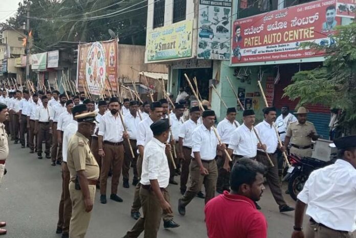 ರಾಷ್ಟ್ರೀಯ ಸ್ವಯಂ ಸೇವಕ ಸಂಘ ಹೊಸಪೇಟೆ ನಗರದಿಂದ ಹಮ್ಮಿಕೊಂಡಿದ್ದ ಆಕರ್ಷಕ ಪಥ ಸಂಚಲನ, ಹಂಪಿ ರಸ್ತೆಯ ಹಳೆ ವಾಸವಿ ಶಾಲೆ, ಥಿಯಾಸಾಫಿಕಲ್ ಕಾಲೇಜು ಎದುರು ನಿಂದ ಪ್ರಾರಂಭಗೊಂಡಿತು. ಅಲ್ಲಿಂದ ಮಲ್ಲಿಗೆ ಹೋಟೆಲ್, ಸಾರಿಗೆ ಬಸ್ ಡಿಪೋ ಸರ್ಕಲ್, ಜಗಳಿಕಟ್ಟಿ ರಾಯರ ಪ್ರದೇಶ, (ವಿಜಯಾ ಟಾಕೀಸ್), ಲಕ್ಷ್ಮೀ ಮೆಡಿಕಲ್ (ಮೇನ್ ಬಜಾರ್), ಪಾದಗಟ್ಟೆ ಆಂಜಿನೇಯ ದೇವಾಲಯ, ಮಹಾತ್ಮ ಗಾಂಧಿ ವೃತ್ತ, ಪುಣ್ಯ ಮೂರ್ತಿ ಸರ್ಕಲ್, ಸಿದ್ದಿ ವಿನಾಯಕ ದೇವಾಲಯ, ಕಾಮಧೇನು ಸ್ವೀಟ್ಸ್, ಬಿಡಿಸಿಸಿ ಬ್ಯಾಂಕ್, ಪುನೀತ್ ರಾಜ್ ಕುಮಾರ್ ಸರ್ಕಲ್, ರಾಣಿ ಪೇಟೆ, ಎಸ್ ವಿಕೆ ಬಸ್ ನಿಲ್ದಾಣ, ಹಂಪಿ ರಸ್ತೆ ಮೂಲಕ, ಹಳೆ ವಾಸವಿ ಶಾಲೆ, ಥಿಯಾಸಾಪಿಕಲ್ ಕಾಲೇಜು ತಲುಪಿತು. ನಗರದ ದಾರಿಯುದ್ದಕ್ಕೂ ಬಹುತೇಕ ಎಲ್ಲ ಮನೆಗಳ ಎದುರು ತಾಯಂದಿರು ರಸ್ತೆಗಳಿಗೆ ರಂಗೋಲಿ ಬಿಡಿಸಿ, ಪುಷ್ಪಗಳೊಂದಿಗೆ ಅಲಂಕರಿಸಿ ಸ್ವಾಗತಿಸಿದರು. ಪಥ ಸಂಚಲನ ಸಾಗುತ್ತಿದ್ದಂತೆ ನಾಗರಿಕರು ಪುಷ್ಪಗಳನ್ನು ಸಮರ್ಪಿಸಿದರು.