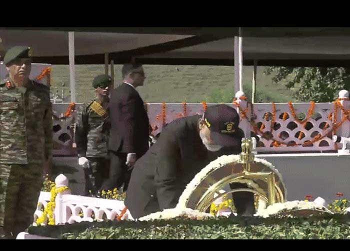 ಕಾರ್ಗಿಲ್ ಯುದ್ಧ ಸ್ಮಾರಕಕ್ಕೆ ಶುಕ್ರವಾರ ಬೆಳಗ್ಗೆ ಭೇಟಿ ನೀಡಿದ ಪ್ರಧಾನಿ ನರೇಂದ್ರ ಮೋದಿ ಅವರು ಕಾರ್ಗಿಲ್ ಯುದ್ಧದಲ್ಲಿ ಹುತಾತ್ಮರಾದ ಯೋಧರಿಗೆ ನಮನ ಸಲ್ಲಿಸಿದರು.