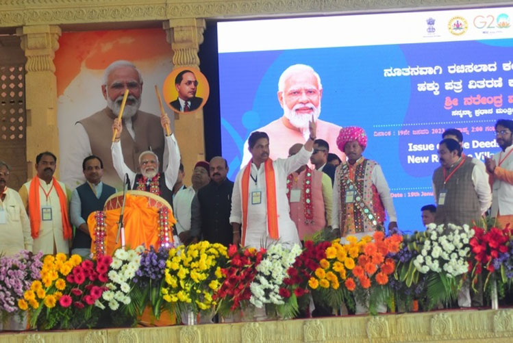 ನಗಾರ್ ಬಾರಿಸುತ್ತಿದ್ದಂತೆ ವೇದಿಕೆ ಮುಂದಿನ ಜನಸೂಮಹ ಚಪ್ಪಾಳೆ ತಟ್ಟುವ ಮೂಲಕ ನಗಾರಿಗೆ ಸಾಥ್ ನೀಡಿದರು. ನಂತರ ಪ್ರಧಾನಿಗಳು ಸಾಂಕೇತಿಕವಾಗಿ 5 ಜನ ಫಲಾನುಭವಿಗಳಿಗೆ ಹಕ್ಕು ಪತ್ರ ವಿತರಿಸಿದಲ್ಲದೆ ಅವರೊಂದಿಗೆ ಕುಶಲೋಪರಿಯಾಗಿ ಮಾತನಾಡಿಸಿದರು.