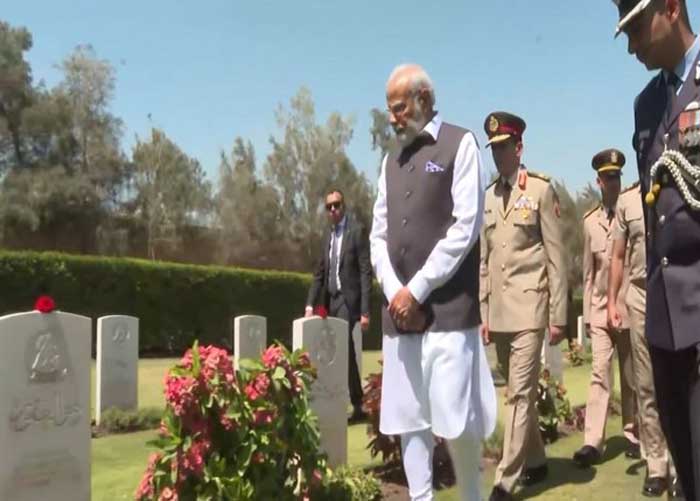 ಪ್ರಧಾನಿ ನರೇಂದ್ರ ಮೋದಿ ಅವರು ಭಾನುವಾರ ಈಜಿಪ್ಟ್‌ನ ಕೈರೋದಲ್ಲಿರುವ ಹೆಲಿಯೊಪೊಲಿಸ್ ಯುದ್ಧ ಸ್ಮಾರಕ್ಕಕೆ ಭೇಟಿ ನೀಡಿ ಮೊದಲ ಮಹಾಯುದ್ಧದ ಸಂದರ್ಭದಲ್ಲಿ ಈಜಿಪ್ಟ್‌ಗಾಗಿ ಹೋರಾಡಿ ತ್ಯಾಗ ಬಲಿದಾನ ಮಾಡಿದ ಭಾರತೀಯ ಸೈನಿಕರಿಗೆ ಗೌರವ ಸಲ್ಲಿಸಿದರು. ಸ್ಮಾರಕದ ಮೇಲೆ ಹೂಗುಚ್ಛವನ್ನಿಟ್ಟು ಕೆಲಕಾಲ ಮೌನವನ್ನಾಚರಿಸಿದರು. ಬಳಿಕ ಪ್ರಧಾನಿ ಮೋದಿ ಕೈರೋದ ಅಲ್-ಹಕೀಮ್ ಮಸೀದಿಗೆ ಭೇಟಿ ನೀಡಿದರು.