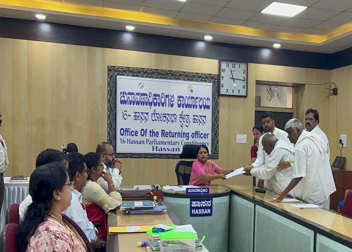 ಜೆಡಿಎಸ್ ಬಿಜೆಪಿ ಮೈತ್ರಿಕೂಟದ ಅಭ್ಯರ್ಥಿ ಪ್ರಜ್ವಲ್ ರೇವಣ್ಣ ಅಧಿಕೃತವಾಗಿ ಇಂದು ನಾಮಪತ್ರ ಸಲ್ಲಿಸಲಿದರು. ಮಾಜಿಪ್ರಧಾನಿ ಎಚ್.ಡಿ ದೇವೇಗೌಡರು ಆಗಮಿಸಿ ಸೂಚಕರಾಗಿ ಸಹಿ ಹಾಕಿ ತೆರಳಿದರು.