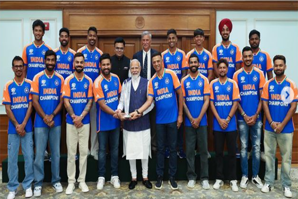 ರೋಹಿತ್ ಶರ್ಮಾ ನೇತೃತ್ವದ ಭಾರತ ಕ್ರಿಕೆಟ್ ತಂಡ ಇಂದು (ಜೂನ್ 4) ಪ್ರಧಾನಿ ನರೇಂದ್ರ ಮೋದಿ ಅವರನ್ನು ಭೇಟಿ ಮಾಡಿದೆ. ಮುಂಜಾನೆ ಬಾರ್ಬಡೋಸ್ನಿಂದ ದೆಹಲಿಗೆ ಬಂದಿಳಿದ ಟೀಂ ಇಂಡಿಯಾ ಆಟಗಾರರು ಮತ್ತು ಸಿಬ್ಬಂದಿ ಬೆಳಿಗ್ಗೆ 11 ಗಂಟೆಗೆ ನವದೆಹಲಿಯ ಲೋಕ ಕಲ್ಯಾಣ್ ಮಾರ್ಗ್ನಲ್ಲಿರುವ ಪ್ರಧಾನಿ ನಿವಾಸವನ್ನು ತಲುಪಿದರು. ಕಾರ್ಯಕ್ರಮದಲ್ಲಿ ಬಿಸಿಸಿಐ ಅಧ್ಯಕ್ಷ ರೋಜರ್ ಬಿನ್ನಿ ಮತ್ತು ಕಾರ್ಯದರ್ಶಿ ಜಯ್ ಶಾ ಉಪಸ್ಥಿತರಿದ್ದರು.