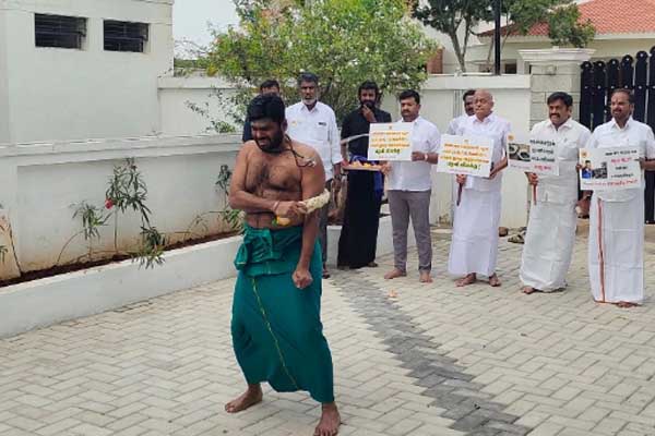 ಇಂದು (ಡಿ.27) ಕೊಯಮತ್ತೂರಿನ ನಿವಾಸದ ಮುಂದೆ ಚಾಟಿಯಲ್ಲಿ ಹೊಡೆದುಕೊಳ್ಳುವ ಮೂಲಕ ಪ್ರತಿಭಟನೆ ನಡೆಸಿದ್ದಾರೆ.
