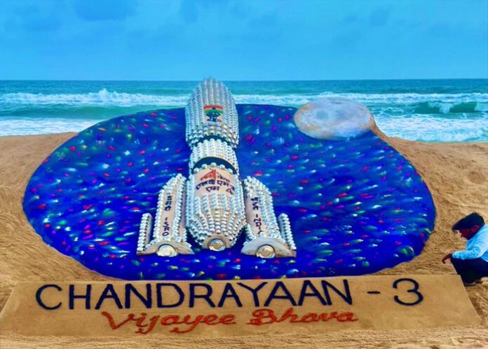 ಭಾರತವು ಬಾಹ್ಯಾಕಾಶ ಕ್ಷೇತ್ರದಲ್ಲಿ ಎಂದೂ ಮರೆಯಲಾಗದ ವಿಶೇಷ ಕ್ಷಣಕ್ಕೆ ಸಾಕ್ಷಿಯಾಗುತ್ತಿದ್ದು, ಈ ವಿಶೇಷ ಸಂದರ್ಭದಲ್ಲಿ ಕಲಾವಿದನೊಬ್ಬ ಮರಳಿನಲ್ಲಿ Chandrayaan 3 ಆಕೃತಿ ರಚಿಸಿ ಶುಭಕೋರಿದ್ದಾರೆ.
