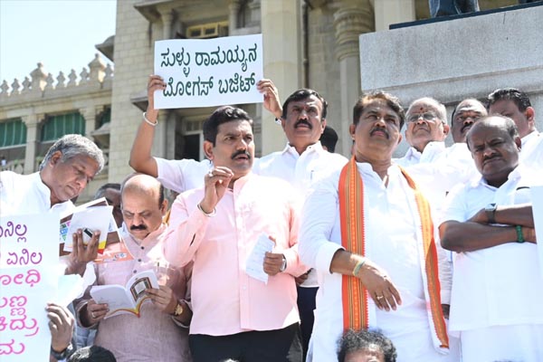 ಸಿಎಂ ಸಿದ್ದರಾಮಯ್ಯ ಅವರು ಬಜೆಟ್ ಮಂಡಿಸುವಾಗ ರಾಜ್ಯ ಸರ್ಕಾರದ ಬಜೆಟ್ ವಿರೋಧಿಸಿ ಬಿಜೆಪಿ- ಜೆಡಿಎಸ್ ಶಾಸಕರು ಶುಕ್ರವಾರ ವಿಧಾನಸೌಧದ ಕೆಂಗಲ್ ಹನುಮಂತಯ್ಯ ಅವರ ಪ್ರತಿಮೆ ಬಳಿ ಪ್ರತಿಭಟನೆ ನಡೆಸಿದವು. ಬಿಜೆಪಿ ರಾಜ್ಯಾಧ್ಯಕ್ಷ ಮತ್ತು ಶಾಸಕ ಬಿ.ವೈ. ವಿಜಯೇಂದ್ರ ಅವರ ನೇತೃತ್ವದಲ್ಲಿ ಪ್ರತಿಭಟನೆ ನಡೆದಿದ್ದು, ವಿಪಕ್ಷ ನಾಯಕ ಆರ್. ಅಶೋಕ್, ಮಾಜಿ ಮುಖ್ಯಮಂತ್ರಿ ಬಸವರಾಜ ಬೊಮ್ಮಾಯಿ, ಮಾಜಿ ಮುಖ್ಯಮಂತ್ರಿ ಮತ್ತು ಜೆಡಿಎಸ್ ರಾಜ್ಯಾಧ್ಯಕ್ಷ ಎಚ್.ಡಿ.ಕುಮಾರಸ್ವಾಮಿ, ಬಿಜೆಪಿ ರಾಜ್ಯ ಪ್ರಧಾನ ಕಾರ್ಯದರ್ಶಿ ಸುನಿಲ್ ಕುಮಾರ್, ಶಾಸಕ ಅರವಿಂದ ಬೆಲ್ಲದ ಹಾಗೂ ಶಾಸಕರು ಉಪಸ್ಥಿತರಿದ್ದರು.