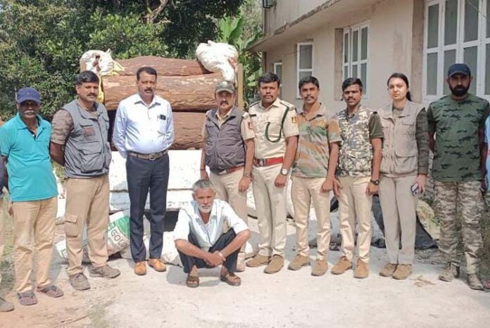 ಘಟನೆ ಹಿನ್ನೆಲೆ: ವೀರಾಜಪೇಟೆ ವಲಯ ಹೆಗ್ಗಳ ಶಾಖೆಯ ಕೊಟ್ಟೋಳಿ-ವೀರಾಜಪೇಟೆ ಮುಖ್ಯರಸ್ತೆ ಮಾರ್ಗವಾಗಿ ಪಿಕ್ಅಪ್ ವಾಹನದ (ಕೆ.ಎಲ್.45-ಎ.1656) ಮೇಲ್ಭಾಗದಲ್ಲಿ ಸಿಹಿ ಗೆಣಸು ಮೂಟೆಗಳನ್ನು ಇಟ್ಟು 11 ಬೀಟೆ ಮರದ ನಾಟಾಗಳನ್ನು ಸಾಗಿಸಲಾಗುತ್ತಿತ್ತು. ವಾಹನವನ್ನು ಪರಿಶೀಲನೆ ನಡೆಸಿದ ಸಂದರ್ಭ ಅಕ್ರಮ ಮರ ಸಾಗಾಟ ಪ್ರಕರಣ ಪತ್ತೆಯಾಗಿದೆ. ಈ ವೇಳೆ ವಾಹನ ಚಾಲಕ ಬೇತು ಗ್ರಾಮದ ನಿವಾಸಿ ಹ್ಯಾರೀಸ್ ಎಂ.ಎ ಎಂಬ ಆರೋಪಿಯನ್ನು ಸ್ಥಳದಲ್ಲೇ ಬಂಧಿಸಲಾಗಿದೆ.