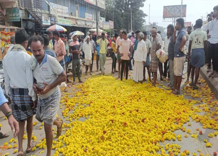 ಹೂವಿನ ಬೆಲೆ ದಿಡೀರ್ ಕುಸಿತಗೊಂಡು ಸೇವಂತಿಗೆ, ಚೆಂಡು ಹೂಗಳನ್ನು ರಸ್ತೆಗೆ ಹಾಕಿ ರೈತರ ಪ್ರತಿಭಟನೆ ನಡೆಸಿದರು.