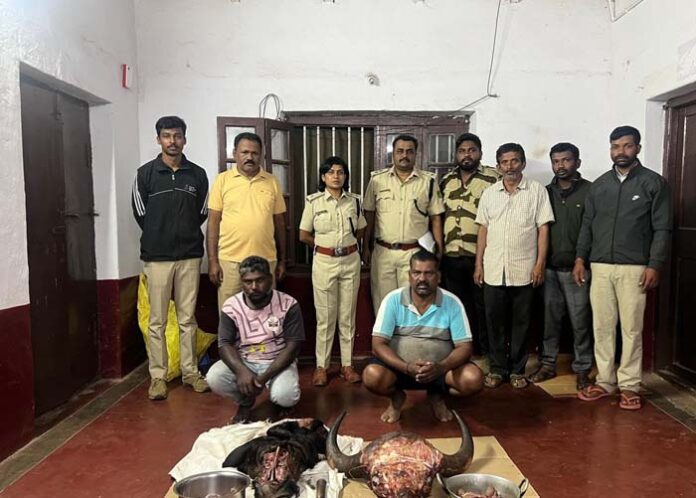 ಮಾಂಸಕ್ಕಾಗಿ ಕಾಡೆಮ್ಮೆಯೊಂದನ್ನು ಅಕ್ರಮವಾಗಿ ಕೋವಿಯಿಂದ ಶೂಟ್ ಮಾಡಿ ಮಾಂಸವನ್ನು ಸೇವಿಸಿದ ಪ್ರಕರಣದಲ್ಲಿ ಅರಣ್ಯ ಇಲಾಖೆ ತಂಡ ಇಬ್ಬರನ್ನು ಬಂಧಿಸಿರುವ ಘಟನೆ ನಡೆದಿದೆ.